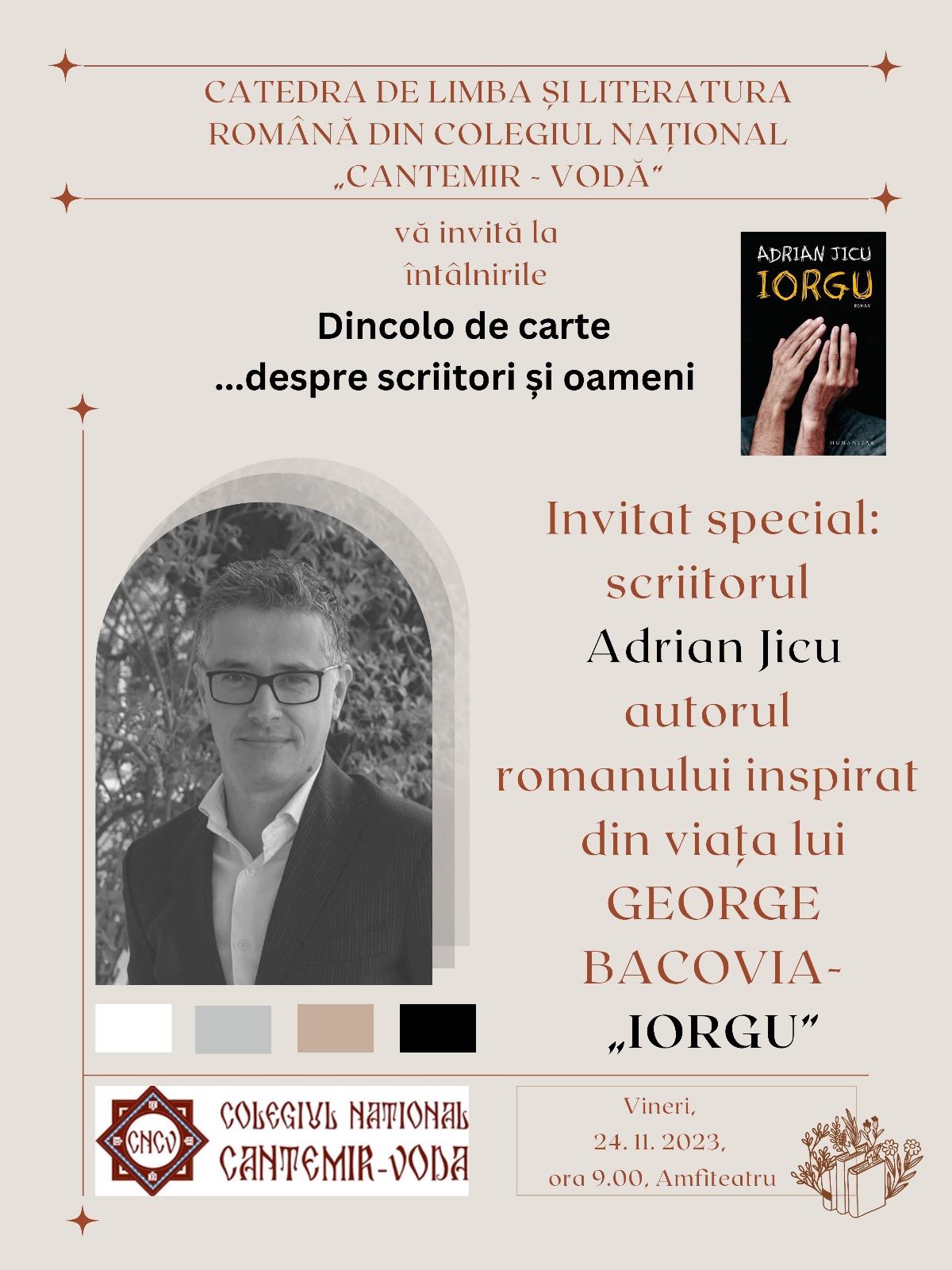 În cadrul întâlnirilor „Dincolo de carte…despre scriitori și oameni”, organizate de Catedra de limbă și literatură română a Colegiului, este invitat FLORIN TOMA, absolvent al Facultăţii de Litere a Universităţii din Bucureşti, SCRIITOR de romane și nuvele. Este, de asemenea, autorul cronicii plastice de la Viața Românească, revistă editată de Uniunea Scriitorilor – al cărei […]